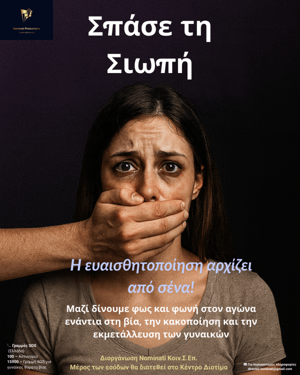 Η Nominati Κοιν.Σ.Επ. (Κοινωνική Συνεταιριστική Επιχείρηση Συλλογικής και Κοινωνικής Ωφέλειας) με έδρα τις Αχαρνές Αττικής παρουσιάζει την καμπάνια «Σπάσε τη Σιωπή». Με στόχο την πρόληψη και την αντιμετώπιση της βίας κατά των γυναικών, η καμπάνια συνδυάζει πολιτισμό, τέχνη και κοινωνική δράση για να δώσει φως και φωνή στον αγώνα ενάντια στην κακοποίηση και την εκμετάλλευση.... Continue Reading →